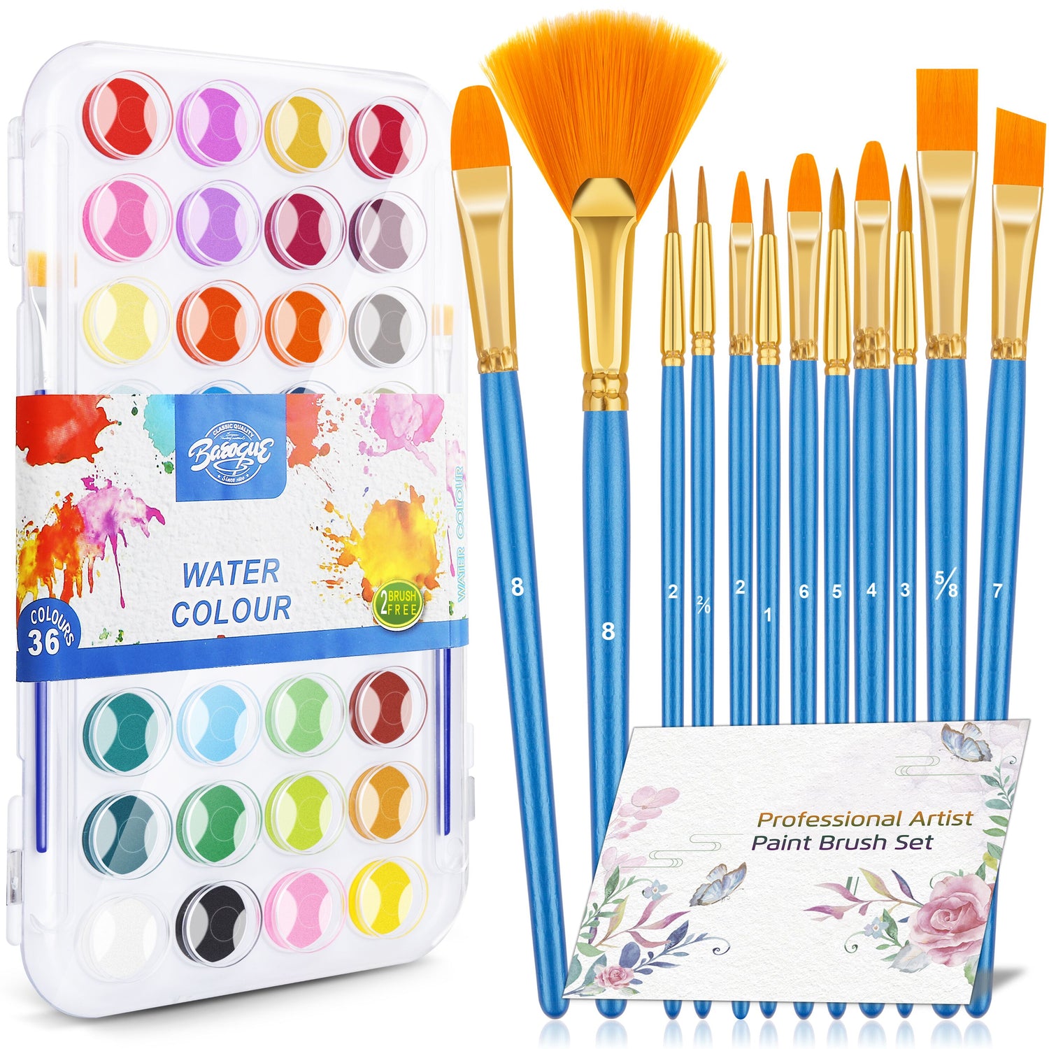 1.This professional grade set comes complete with a selection of 12PCS finely crafted professional style artist brushes, 36 different vibrant colors watercolor and 2PCS free paint brushes. Very affordable price, Great gift for starters, beginners kindergarten toddlers,adults, and art students.