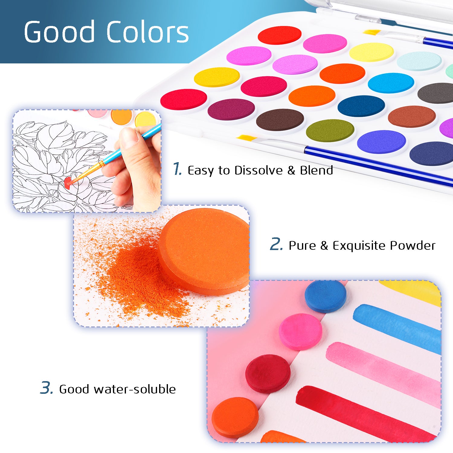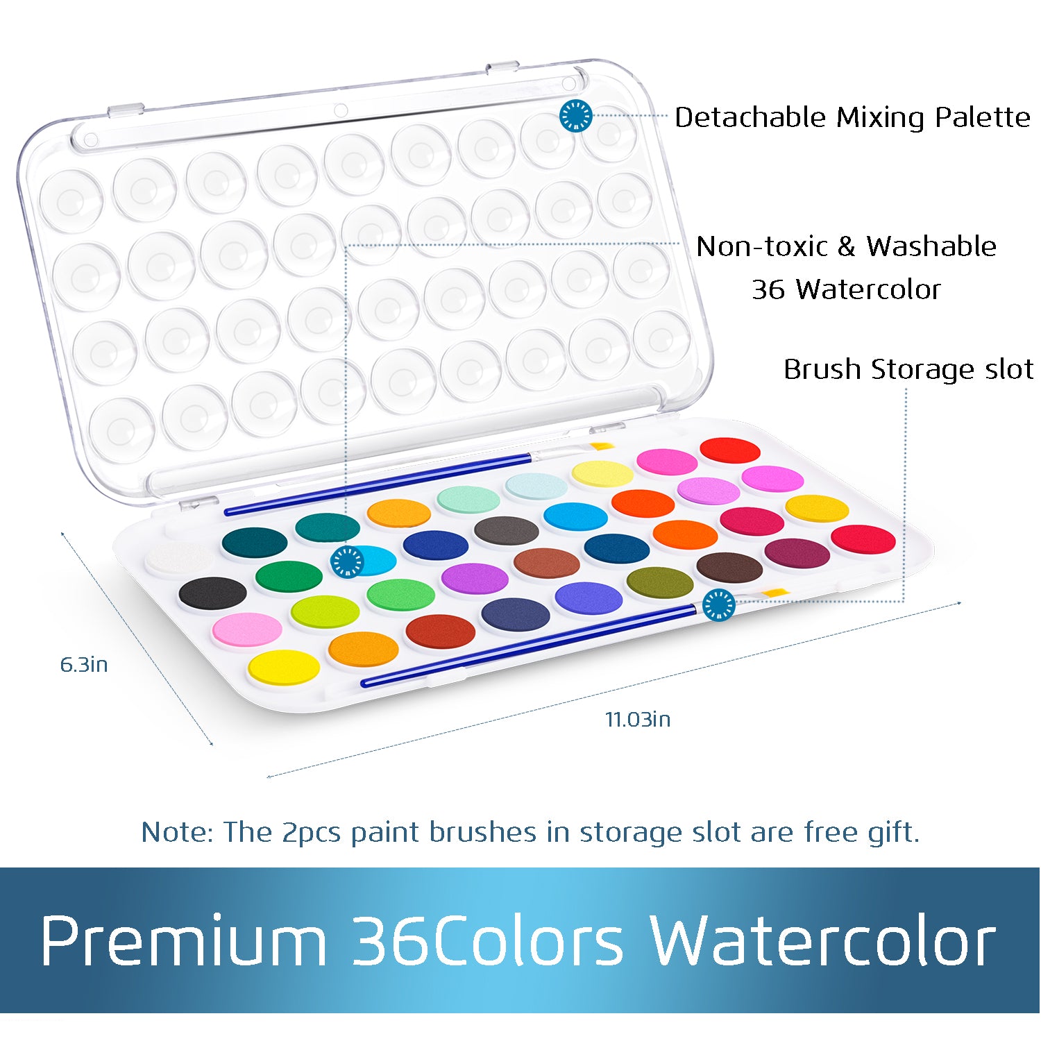 🌈【Health & Non-Toxic Watercolor】: 36 vivid colors painting watercolor are made of premium quality, non-toxic, and acid free, extra fine and purity pigment, suit for both kids above age 3 and adults.