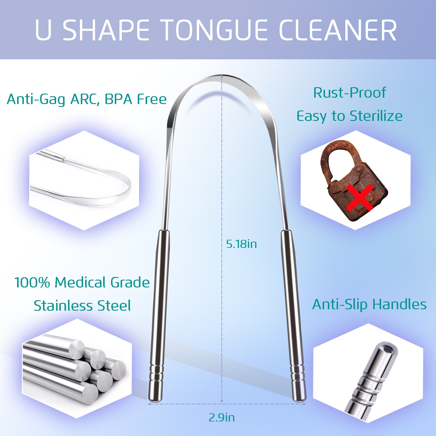 💎【Two Different Tongue Scraper】: Both different shape tongue scraper to satisfy all our need. The U-shaped high-grade medical grade stainless steel scraper is for all people and super easy to use daily, While soft silicon tongue cleaners with 3 differnt color, more gentle for taste buds, suit for multi-place using, such as home, work, school, trip, camping or any other situation.